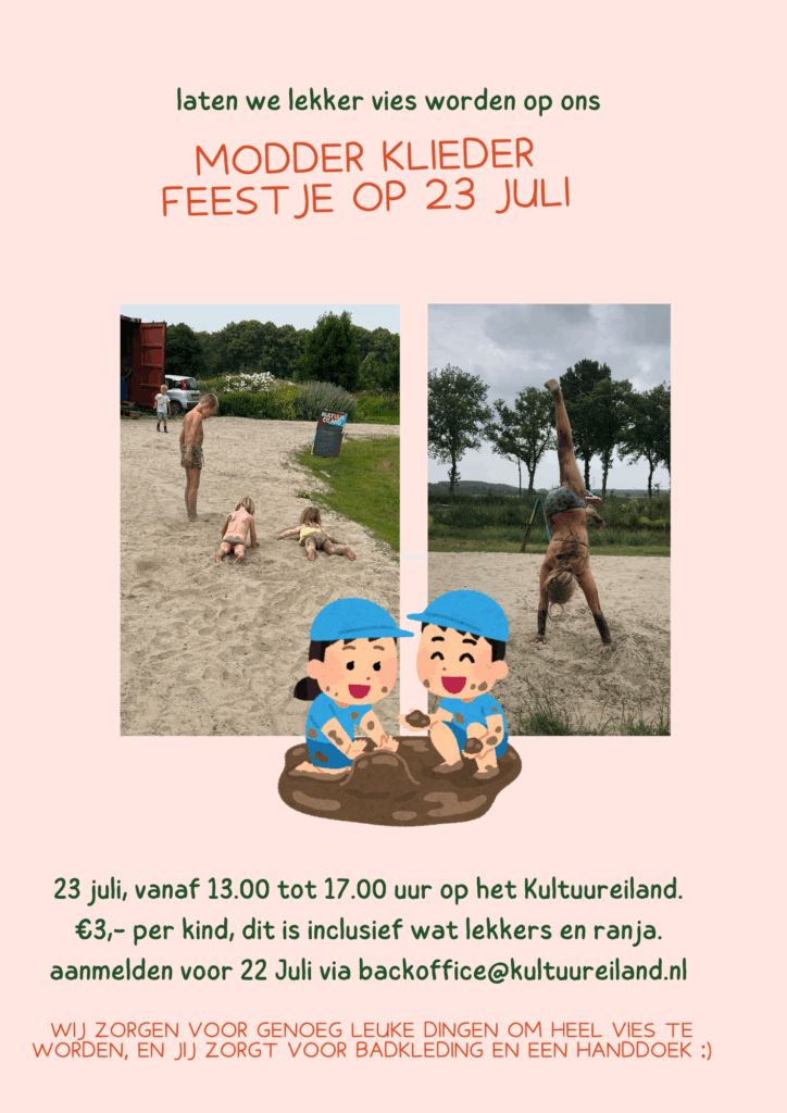 Op 23 juli van 13.00 tot maximaal 17.00 kun je komen spelen, wij zetten diverse activiteiten met modder, klei en water klaar!
