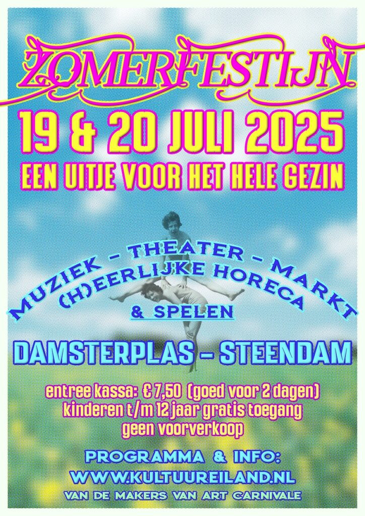 Het is weer bijna zover, de 3e editie van het Kultuureiland Zomerfestijn! Een kleinschalig tweedaags cultureel evenement dat op vrijdag 19 en zaterdag 20 juli plaatsvindt op Kultuureiland Damsterplas.